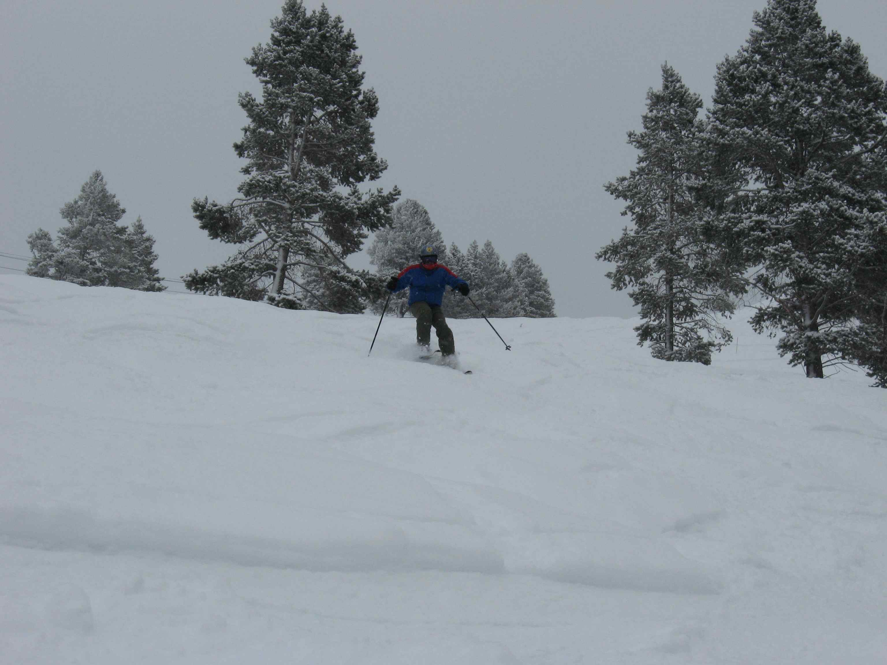 Day 6 – The mountain got about six inches of new snow last night which meant  BOOT-HIGH FRESHIES ALL DAY! It was some of the best powder I’ve seen in ten years, since Utah 1999. We got on the hill early, before 9:00 a.m. JD, Ken and I caught some great powder and tree runs off Blue Ox and Roger’s Run. We also found this cool, natural half-pipe (see pic below) in the trees off of Roger’s. After lunch we hit the Outer Mongolia Bowl and Blue Sky Basin – and still got fresh tracks! Apres skied at The George, their sesame-seared tuna and duck quesadillas are highly recommended! And we drank.