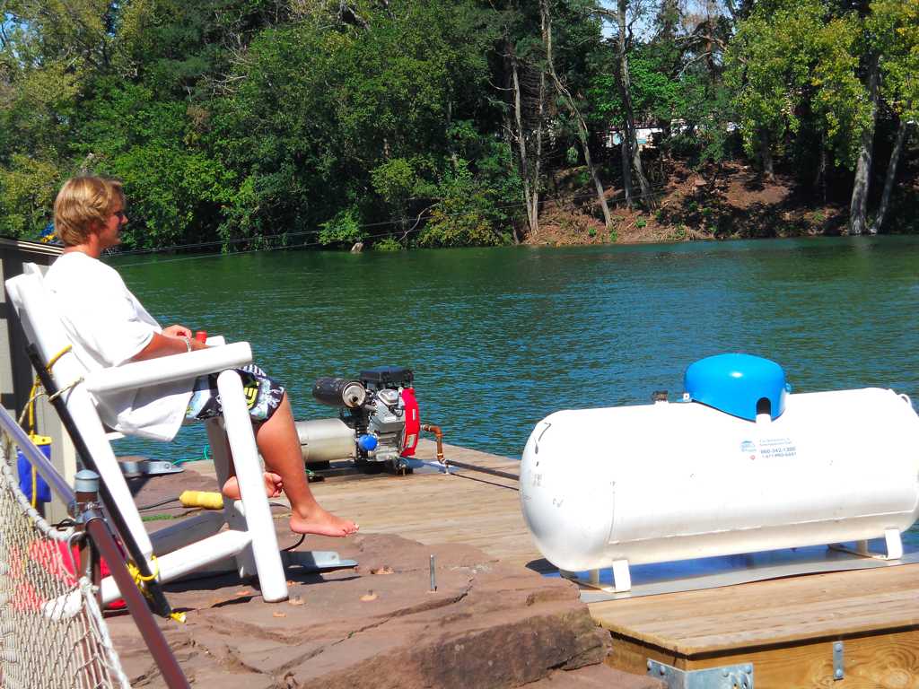The tank provides fuel for the motor. The motor moves the cable. The dude controls the cable with a controller box to let people wakeboard.